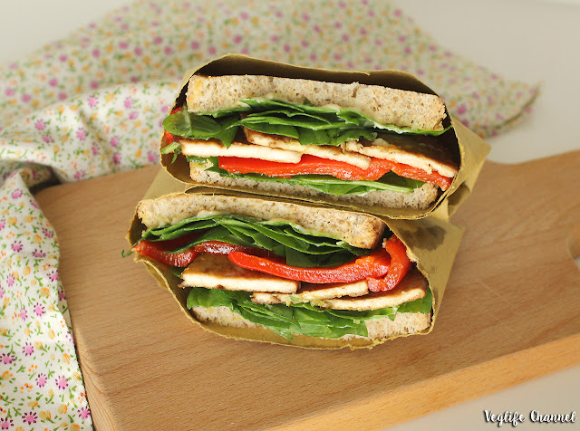 Prepariamo il panino: tostiamo il pane, spalmiamo entrambe le fette con il burro di tahini. Su una fetta mettiamo gli spinaci, i peperoni, il tofu e i restanti spinaci.