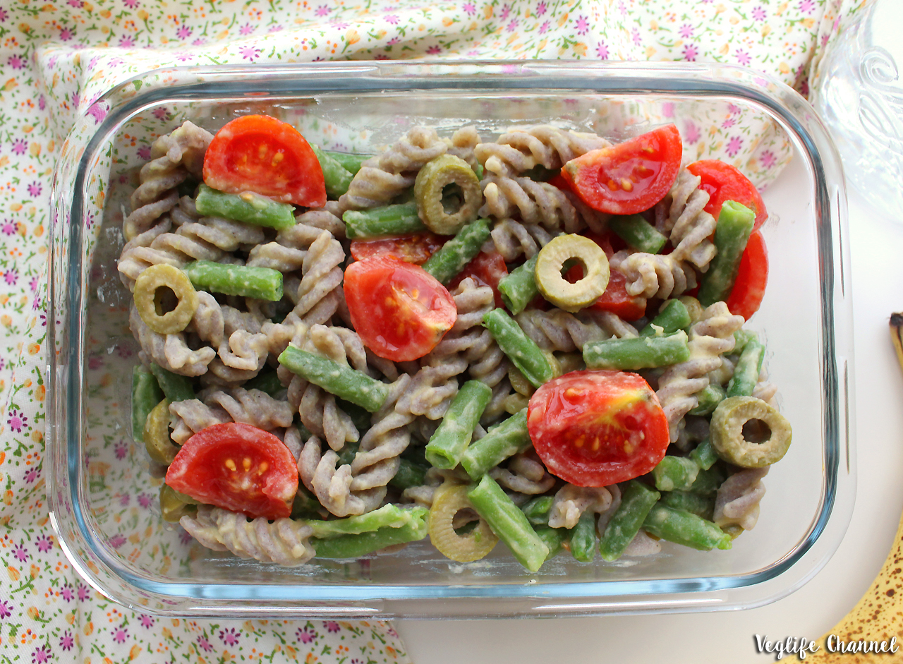 Condiamo la pasta con olio, sale ed hummus. Mescoliamo bene e aggiungiamo i pomodorini e le olive, mescoliamo ancora e trasferiamo in un contenitore di vetro idoneo per il trasporto.