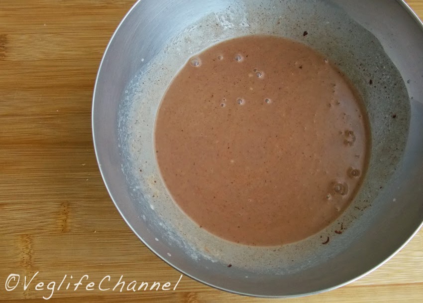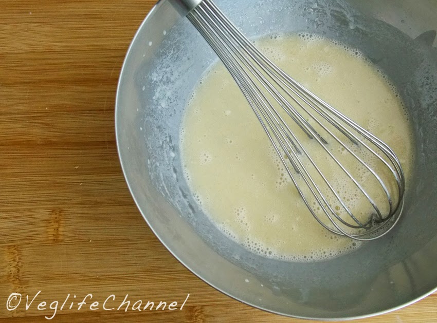 Versiamo il composto liquido su quello di farine e mescoliamo quel tanto che basta per ottenere un composto omogeneo.