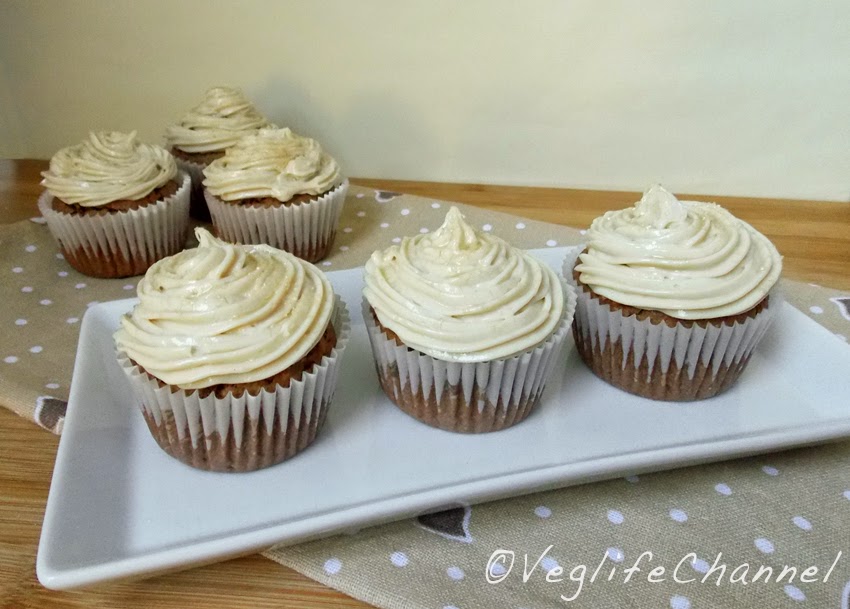 Prepariamo il frosting frullando il tofu, precedentemente pressato (clicca qui per scoprire come pressare il tofu), con lo zucchero a velo, la vaniglia ed il latte vegetale, fino ad ottenere una crema. Trasferire il tutto in una tasca da pasticcere e riporre in frigo per 1 ora.