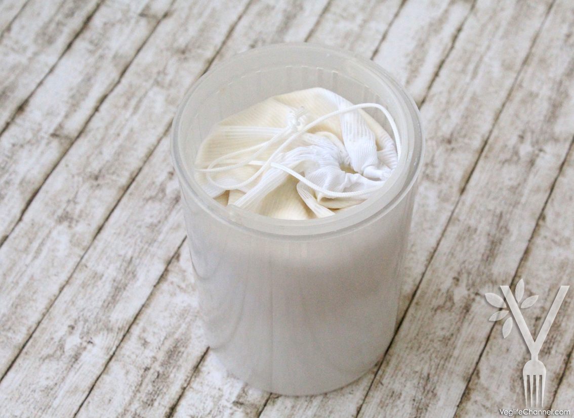 Trasferisco nel barattolo rivestito con il filtro in nylon, chiudo bene il sacchetto, copro con il tappo e ripongo in frigo a scolare dalle 24 alle 48h.