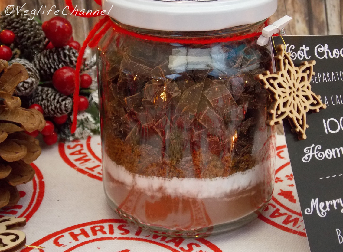 Prendiamo il barattolo poggiamoci sopra un imbuto per marmellate e inseriamo gli ingredienti, cominciando con il cacao amaro, battiamo leggermente il barattolo sul tavolo per livellare il cacao, quindi aggiungiamo la fecola e l’amido, battiamo nuovamente, inseriamo lo zucchero di canna integrale, ripetiamo l’operazione e completiamo con il cioccolato fondente tagliato a pezzi.