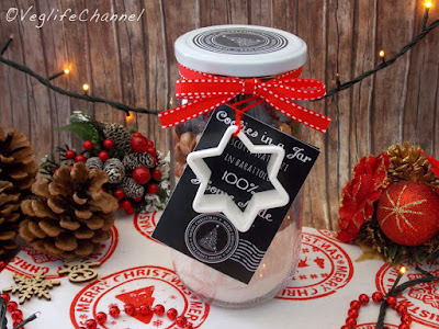 Chiudiamo con un tappo personalizzato e completiamo con qualche decorazione. Io ho scelto di allegare al barattolo uno stampino per biscotti legato con un laccio, completo con un nastro rosso e naturalmente le istruzioni per preparare i biscotti natalizi.