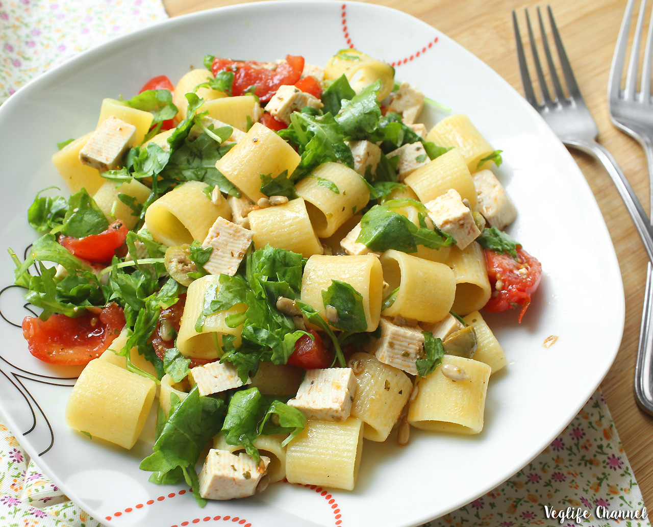 Pasta fredda con pomodorini, rucola e tofu marinato