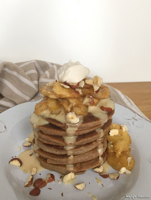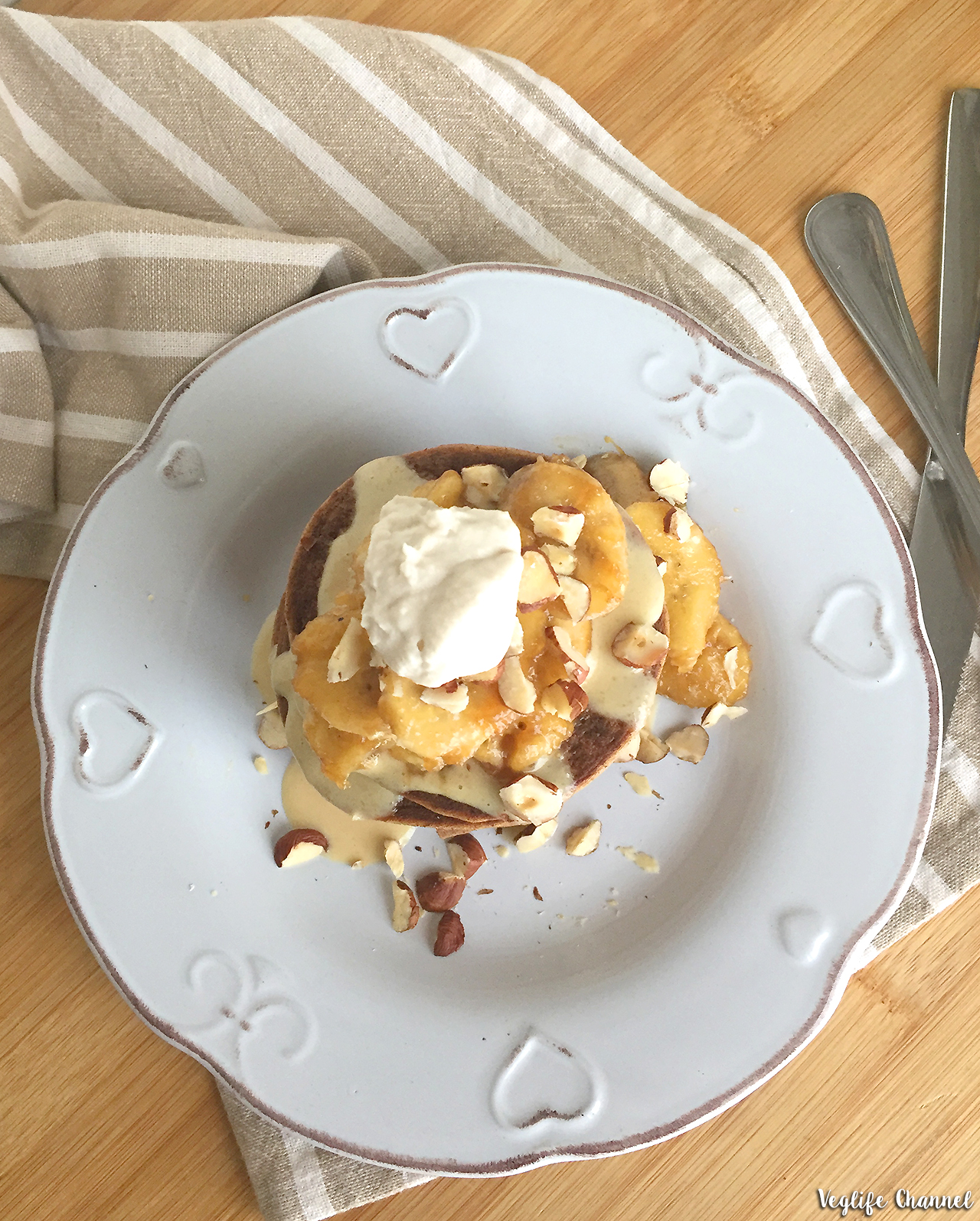Completiamo i pancakes impilandoli uno sull’ altro e farciamoli con una generose dose di salsa, la banana caramellata, le nocciole e un cucchiaio di yogurt di soia.
