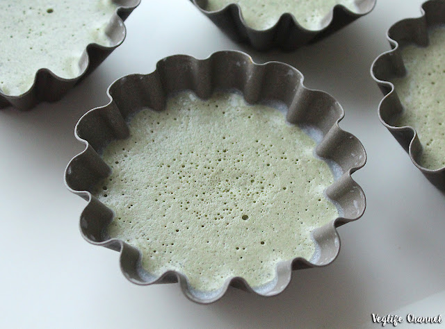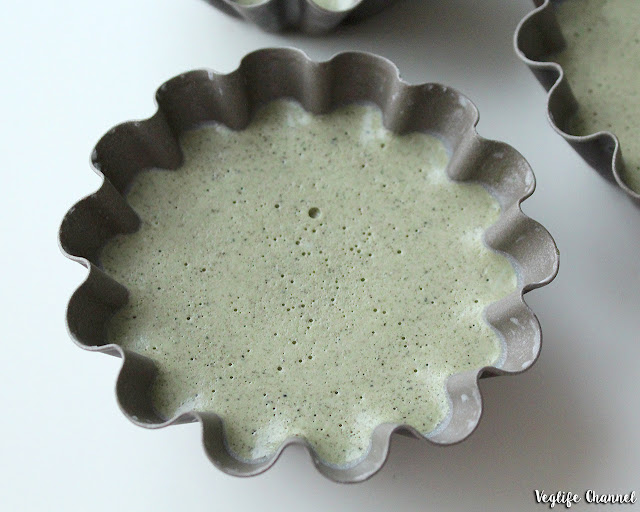 Ungiamo 4 stampi per budino con poco olio di cocco, appoggiamoli su un vassoio, quindi versiamo il liquido in ogni stampo, filtrandolo attraverso un colino (questa operazione serve per ridurre la schiuma).