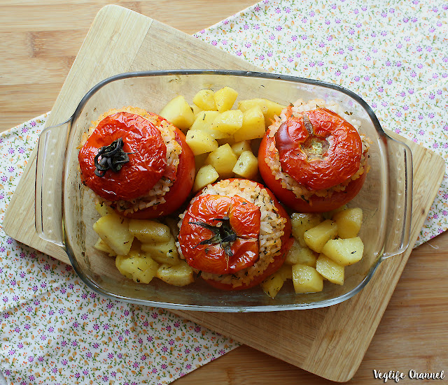Cuociamo i pomodori e le patate nel forno preriscaldato a 190° per 45-50 minuti.