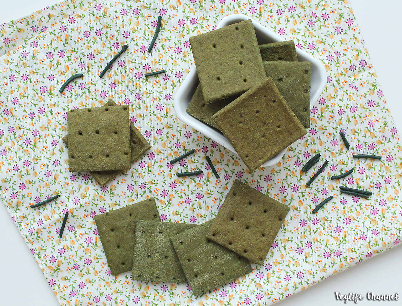 Anche questi crackers sono di colore verde, ma di una tonalità più chiara e delicata rispetto ai biscotti ed il sapore della spirulina non si percepisce quasi per nulla.