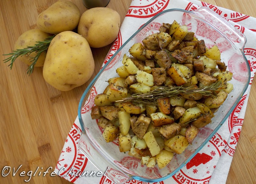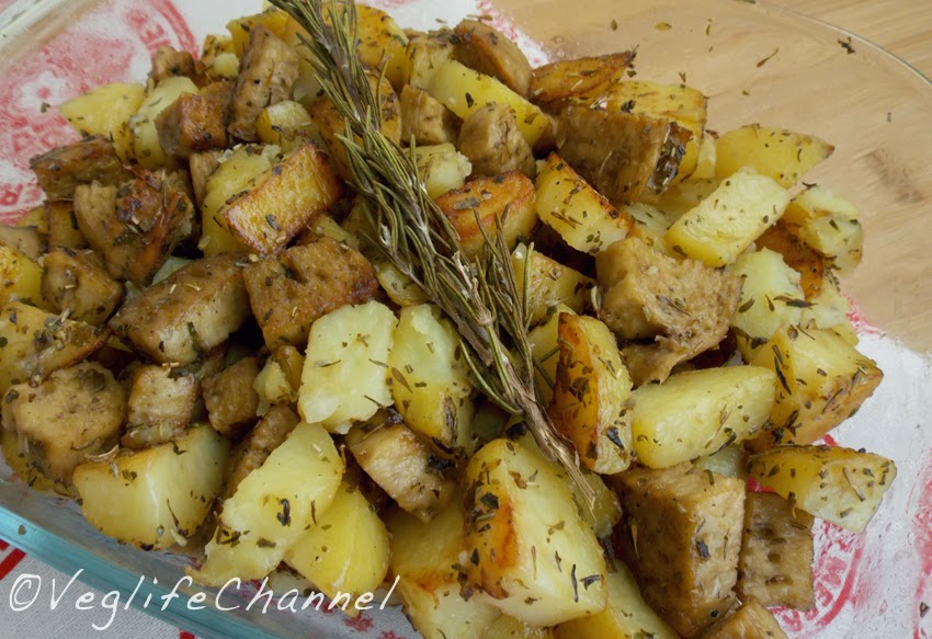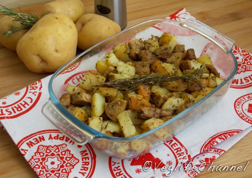 Preriscaldiamo il forno a 200°. Peliamo e tagliamo a cubetti le patate. Tagliamo il seitan allo stesso modo. In un’ ampia ciotola versiamo le patate ed il seitan.