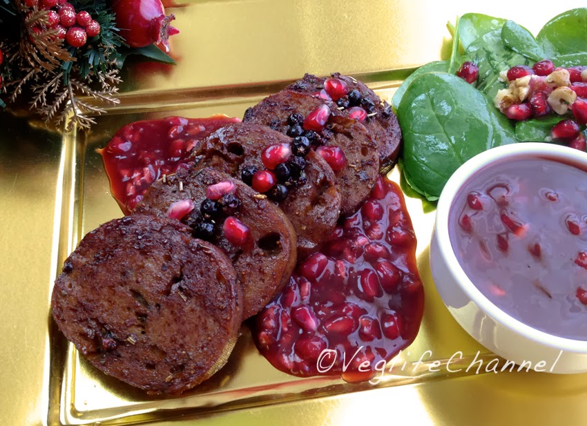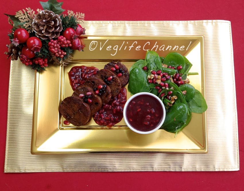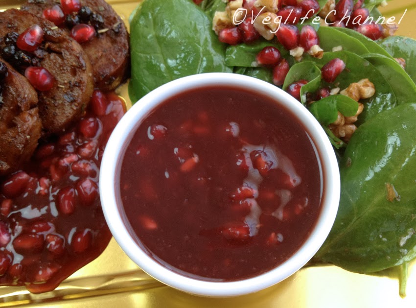 Mentre il seitan cuoce, assembliamo l’insalata. In una ciotola mettiamo gli spinaci, i gherigli sminuzzati e l’altro melograno sgranato. Condiamo con sale ed olio. Assembliamo il tutto, ponendo la salsa sulla base del piatto, appoggiamo le fette di seitan sopra e accompagniamo con l’insalata.