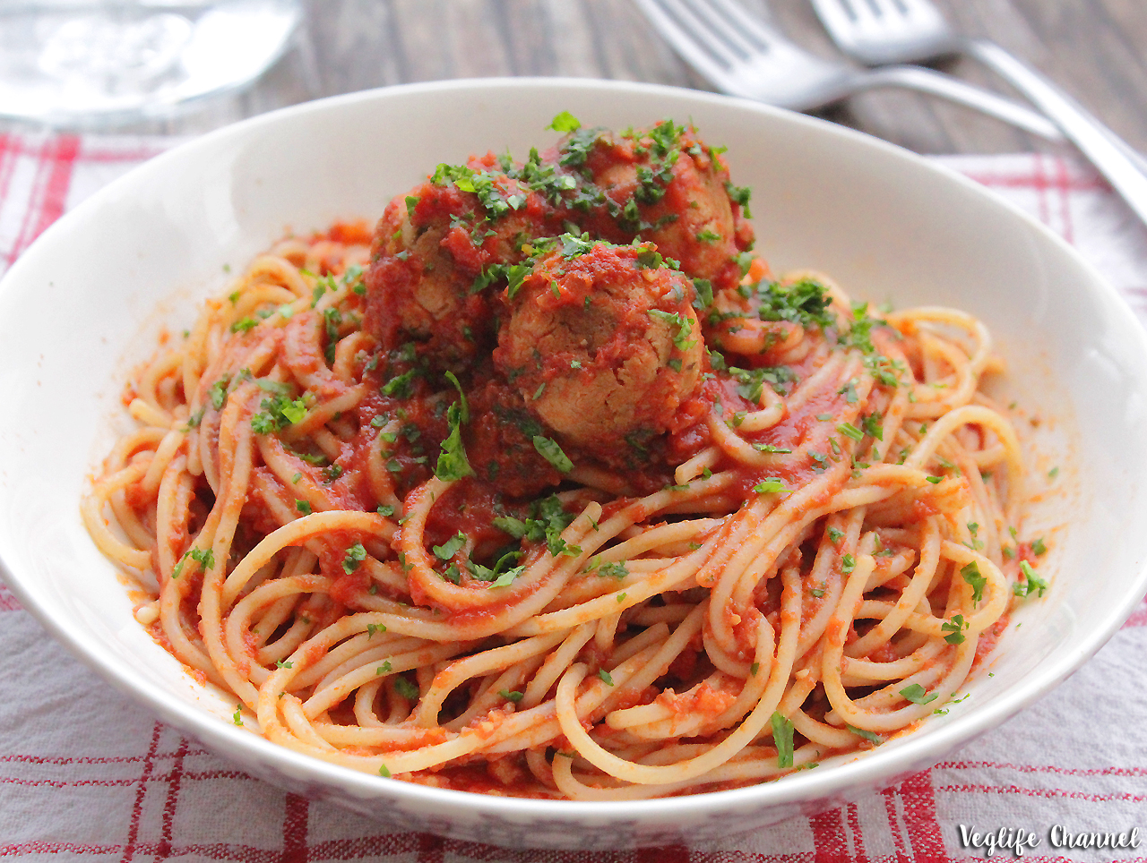 SPAGHETTI DI RISO INTEGRALE CON POLPETTE DI SOIA AL SUGO