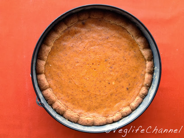 Preparare la farcia frullando insieme il silk tofu, l’olio e metà dose di zucchero. Trasferire in una ciotola e unire la polpa della zucca ed il resto degli ingredienti (compresa la seconda metà dose di zucchero).