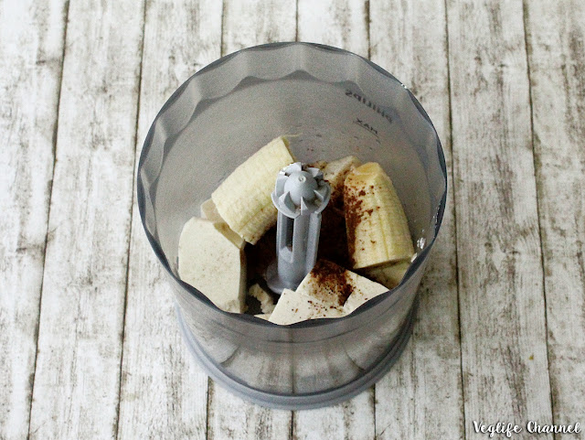 In un frullatore, o in un robot da cucina, inseriamo il silk tofu, mezza banana, il cacao (o carruba in polvere), lo zucchero di cocco e le proteine isolate di piselli.