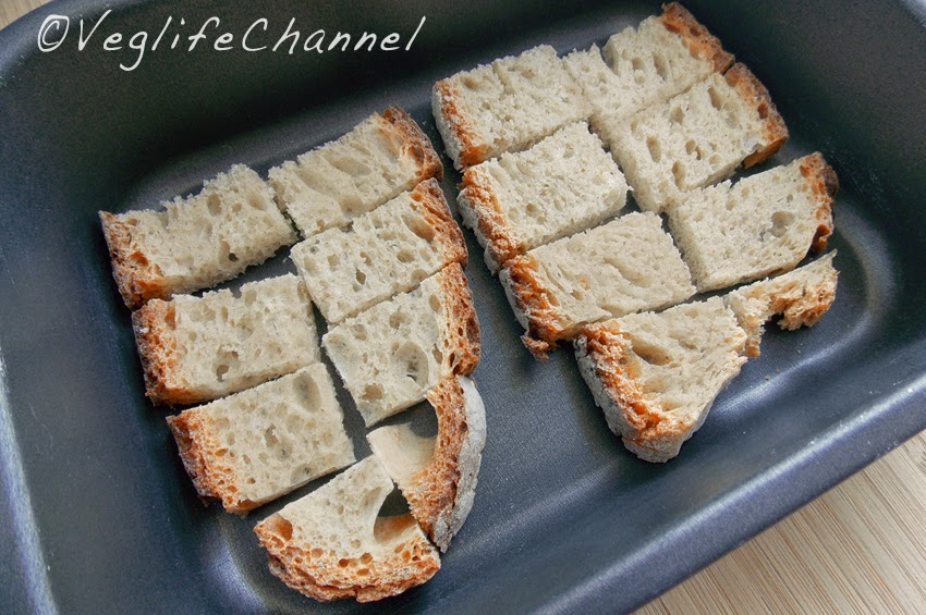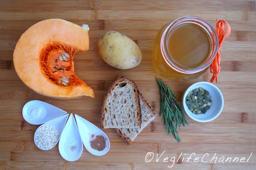 Mentre la zucca cuoce, tostiamo il pane nel forno preriscaldato a 200° per 10 minuti (girandolo a metà cottura).